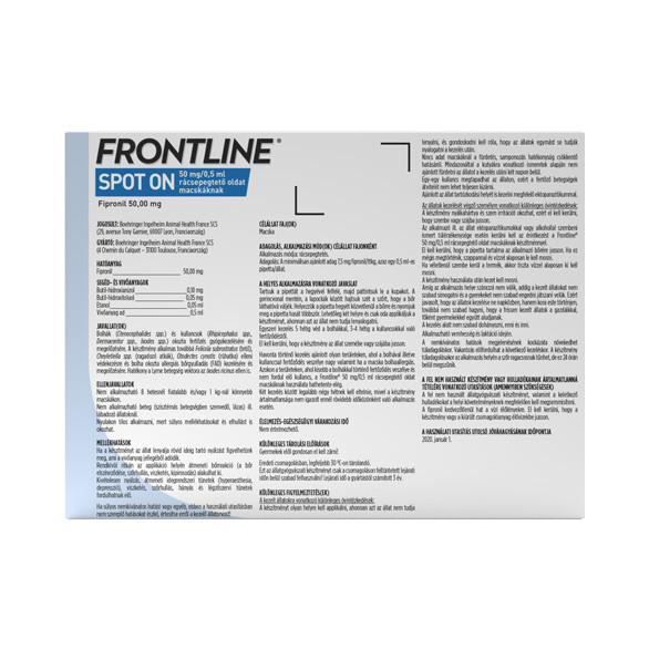 Frontline Spot -on rácsepegtető oldat, a bolhák (Ctenocephalides spp.) és a kullancsok (Rhipicephalus spp., Dermacentor spp., Ixodes spp.) okozta fertőzések gyógykezelésére és megelőzésére kifejlesztett készítmény.